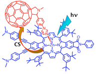 Two novel β-functionalized push-pull zinc porphyrins with amine or phenyl push groups and cyclic imide or carboxylic esters pull-groups have been newly synthesized for light energy harvesting applications. Donor-acceptor conjugates were subsequently built and characterized by coordinating an electron acceptor, C60Im, via metal-ligand axial coordination.